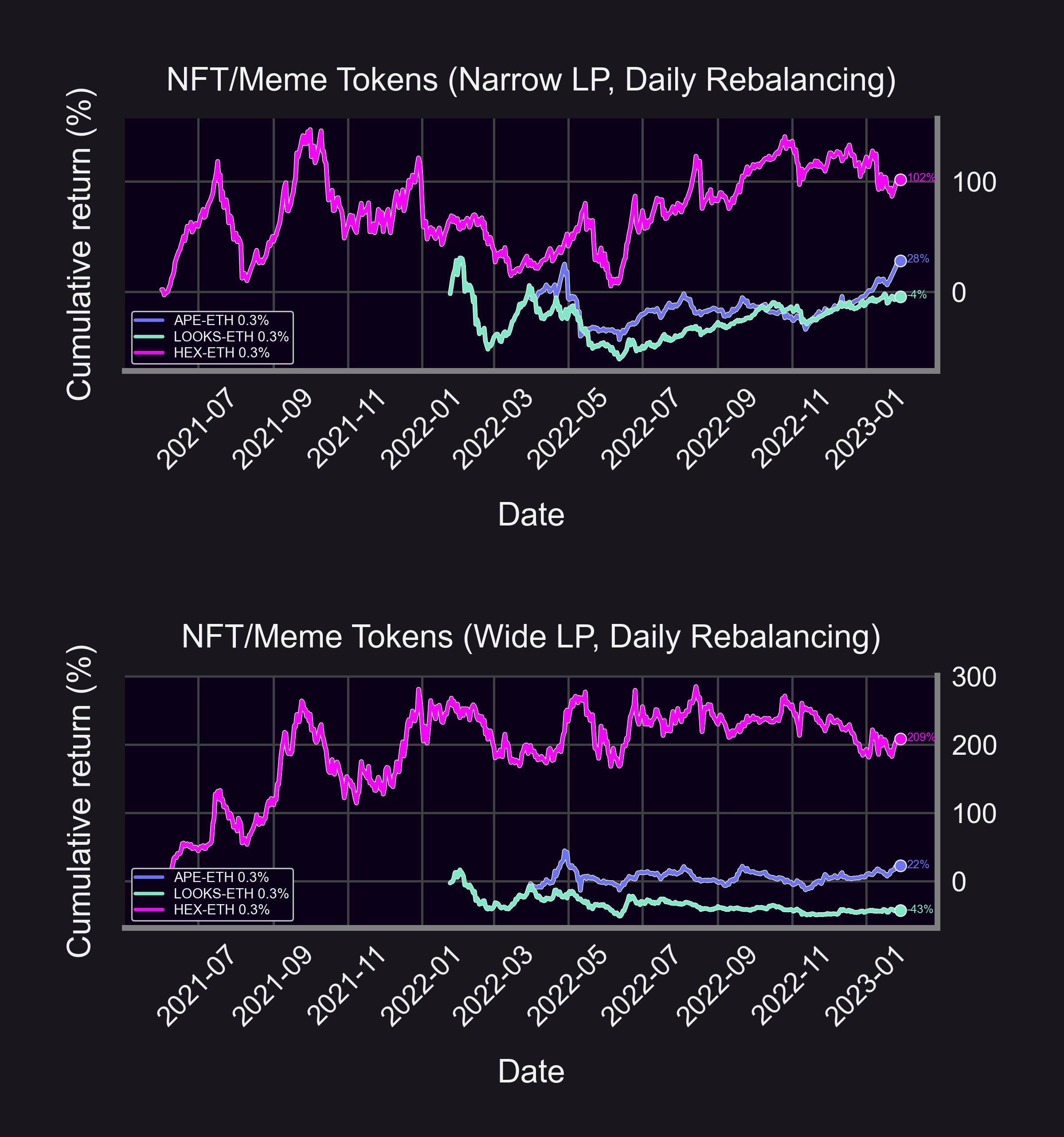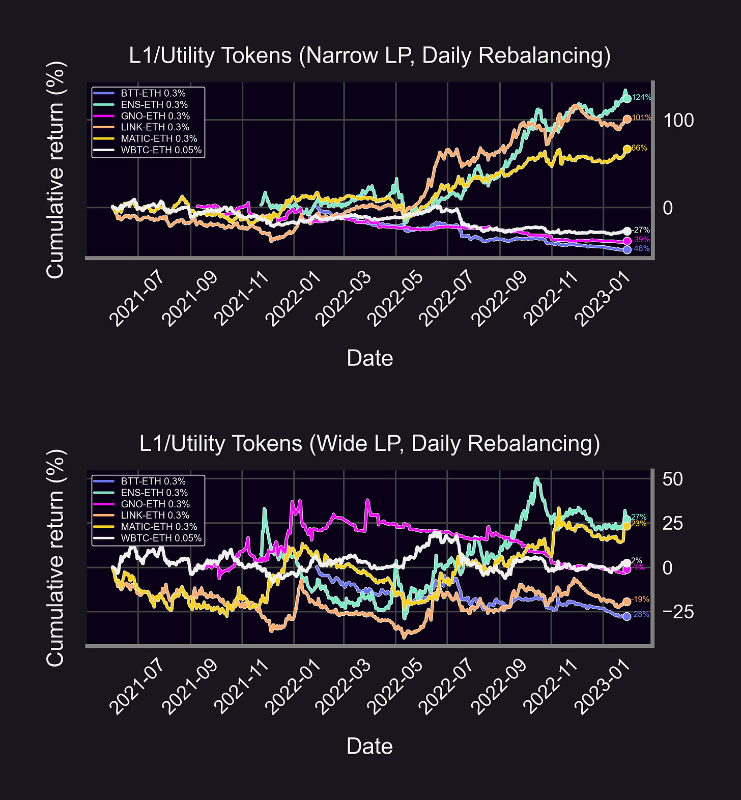 We simulated LP performance for 21 popular Uni V3 pools (high TVL & volume).